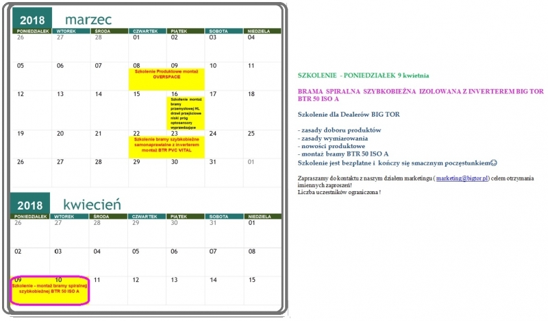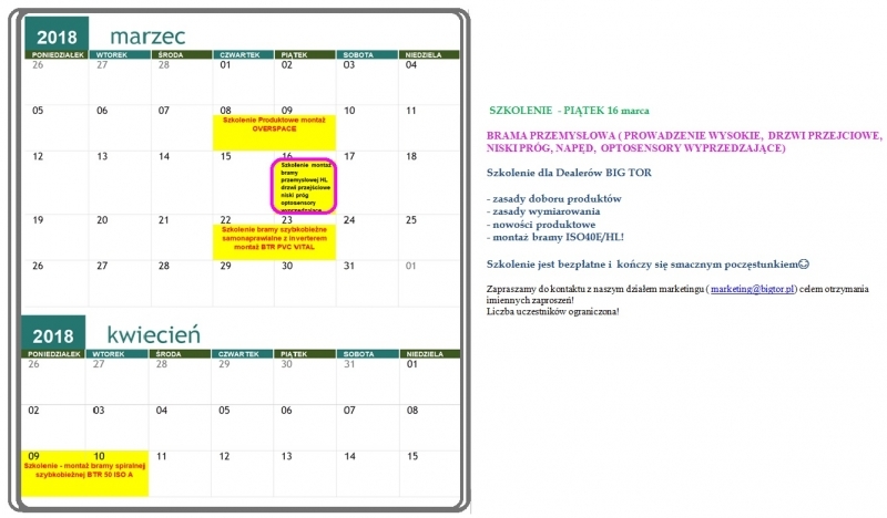 Szanowni Państwo, w czwartek 8 marca i piątek 9 marca firma BIG TOR organizuje szkolenia dotyczące nowej bramy BIG TOR OVERSPACE. Mamy jeszcze kilka wolnych miejsc na szkolenie w czwartek. Chęć uczestnictwa prosimy zgłaszać na : marketing@bigtor.pl. SERDECZNIE ZAPRASZAMY !