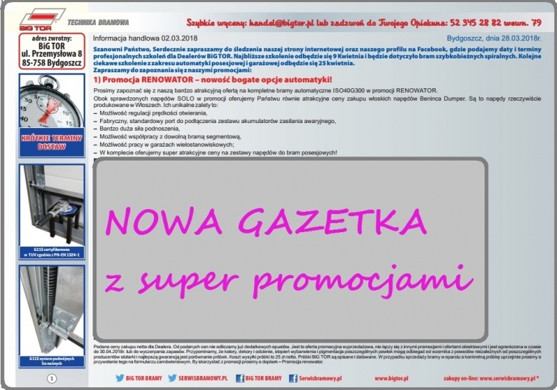 Nowy wymiar promocji RENOWATOR – kompletne, pozbawione oszczędności bramy typowe z panela o pełnej grubości #40mm izolacji PUR z niezawodną automatyką SOLO uzupełniliśmy o dodatkowe opcje automatyki firmy Beninca