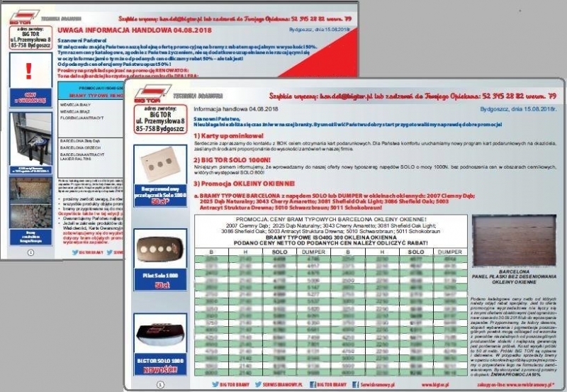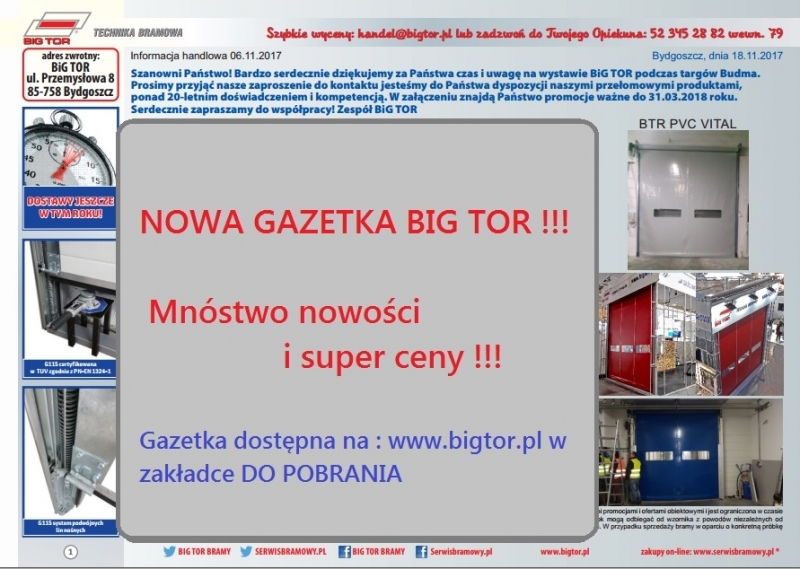 - Nowe niższe ceny na bramy szybkobieżne BiG TOR PVC VITAL – tu zapraszamy do składania zapytań ponieważ oferujemy atrakcyjne rabaty ilościowe na te produkty.